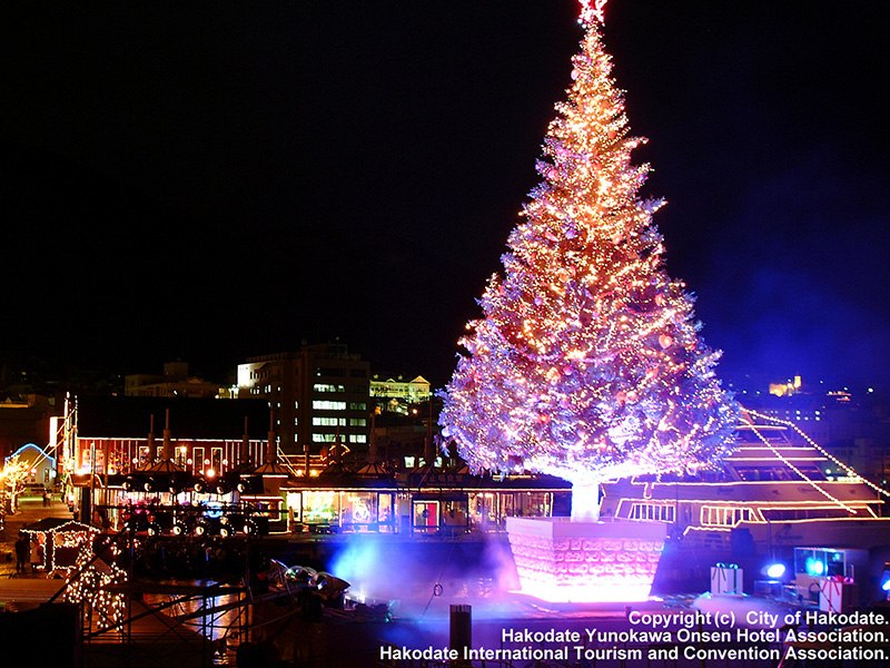 赤レンガ倉庫群前の海上に巨大なクリスマスツリーが登場します。巨大ツリーは、函館市の姉妹都市カナダ・ハリファックス市からの贈り物。ツリーや港町を彩る多くのイルミネーションがHAKODAEの冬を彩ります。